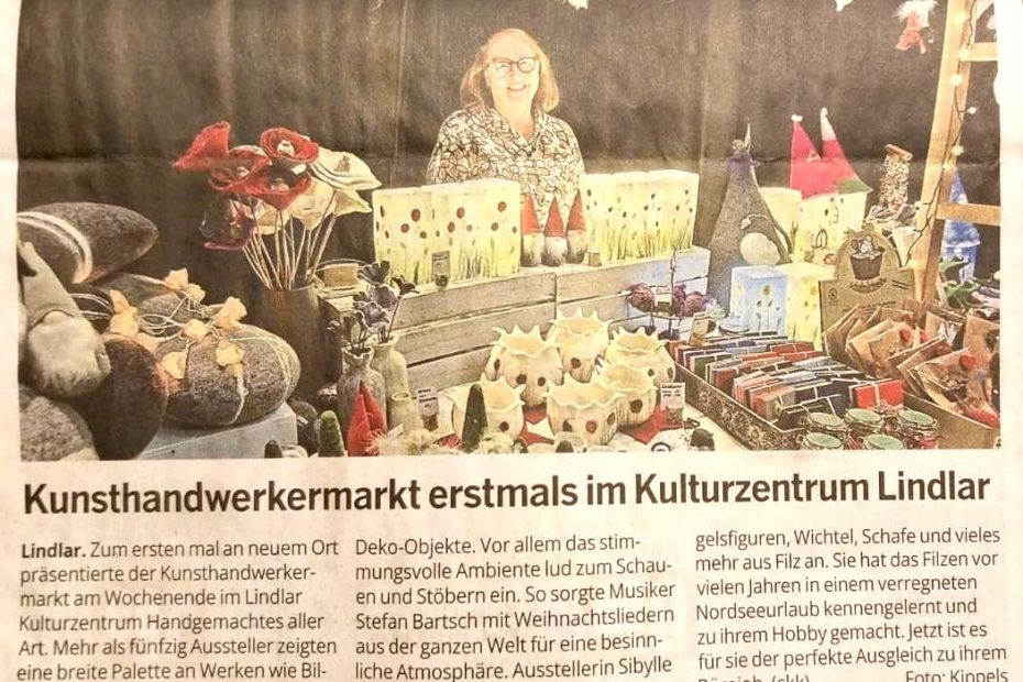 Zeitungsartikel Oberbergische Volkszeitung erschienen am 07.11.2023 Schmuck, Taschen und Schokolade Beim Kunsthandwerkermarkt in Lindlar herrschte großer Andrang – Fast 90 Aussteller auf dem 2t-Gelände Lindlar.… Weiterlesen »Schmuck, Taschen & Schokolade – Presseartikel zum Markt in Lindlar 11/2023